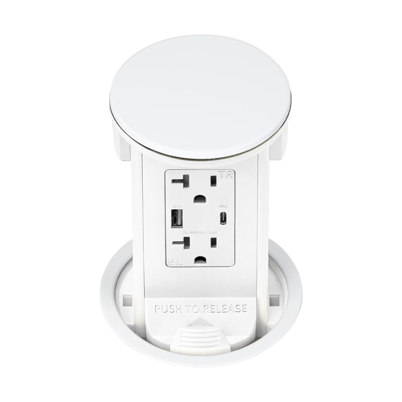 The Lew Electric PUR20ACD-AWT-WT is a round retractable countertop pop-up power outlet that hides in kitchen countertops, or any worktop surface, and offers protection from liquids. Press the top and pull-up the outlet to gain access to the plugs. When the outlet is not needed, the unit hides out of the way and disappears under the counter. The round top is a durable metal white finish, the color blends well with white countertops.