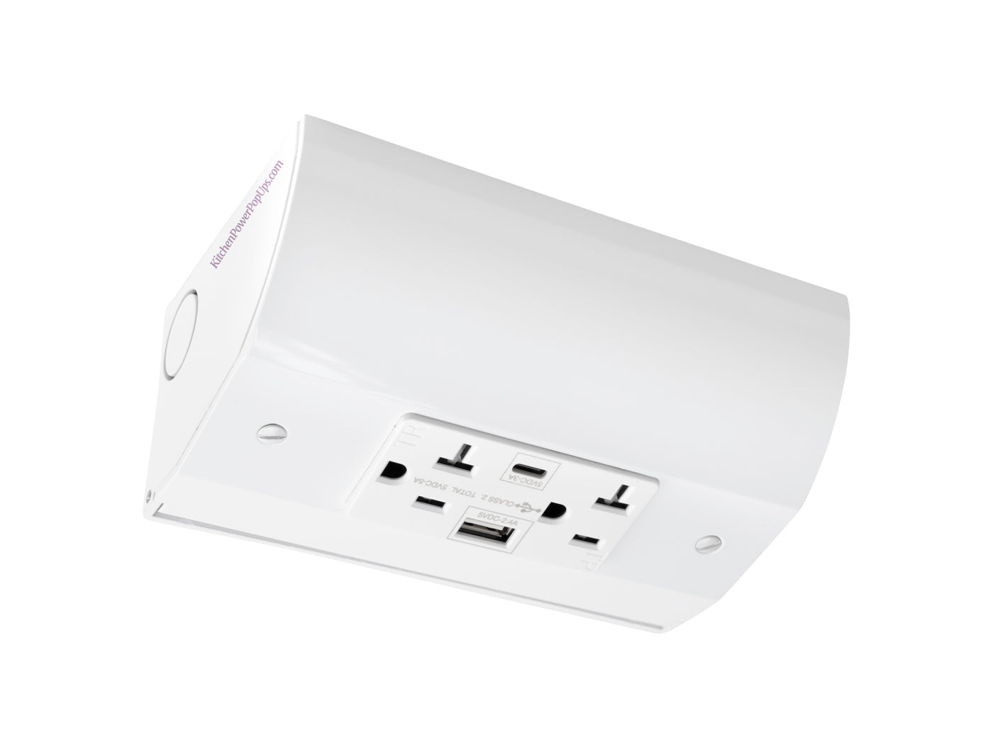 Traditional outlets installed directly into the backsplash often disrupt the look; under-cabinet boxes provide the same convenience and safety, but in a concealed mounting location that preserves your kitchen design. With a sleek, low-profile housing and matching white power outlet, this model blends into cabinet undersides for a discreet, minimalist appearance, ideal for modern white cabinetry, or clean design aesthetics.