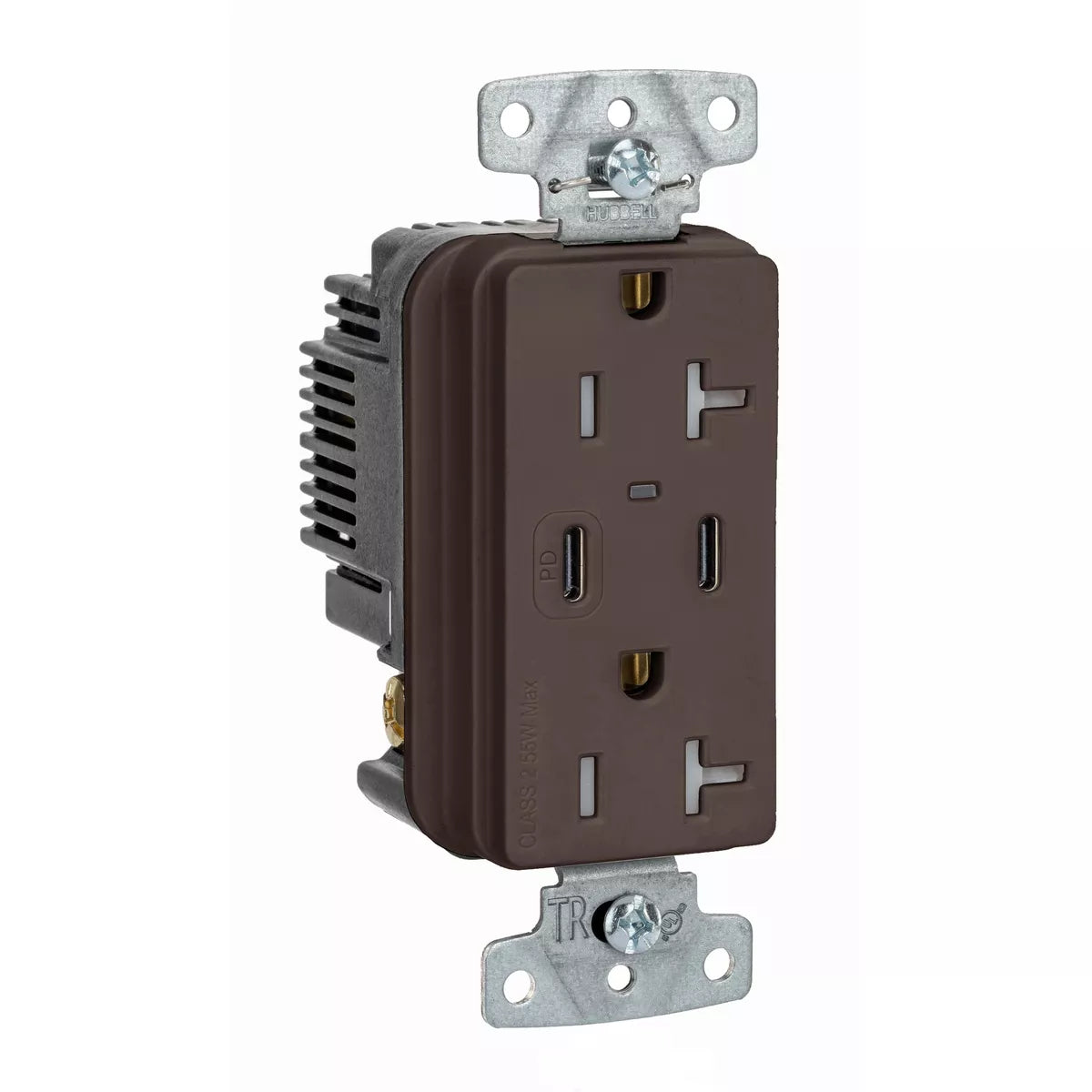 The Hubbell USB20CPD is a dual port USB-C outlet designed not only for power, but for extreme fast charging of USB-C devices. The outlet is brown in color, 20 amp rated, and features tamper-resistant plugs.