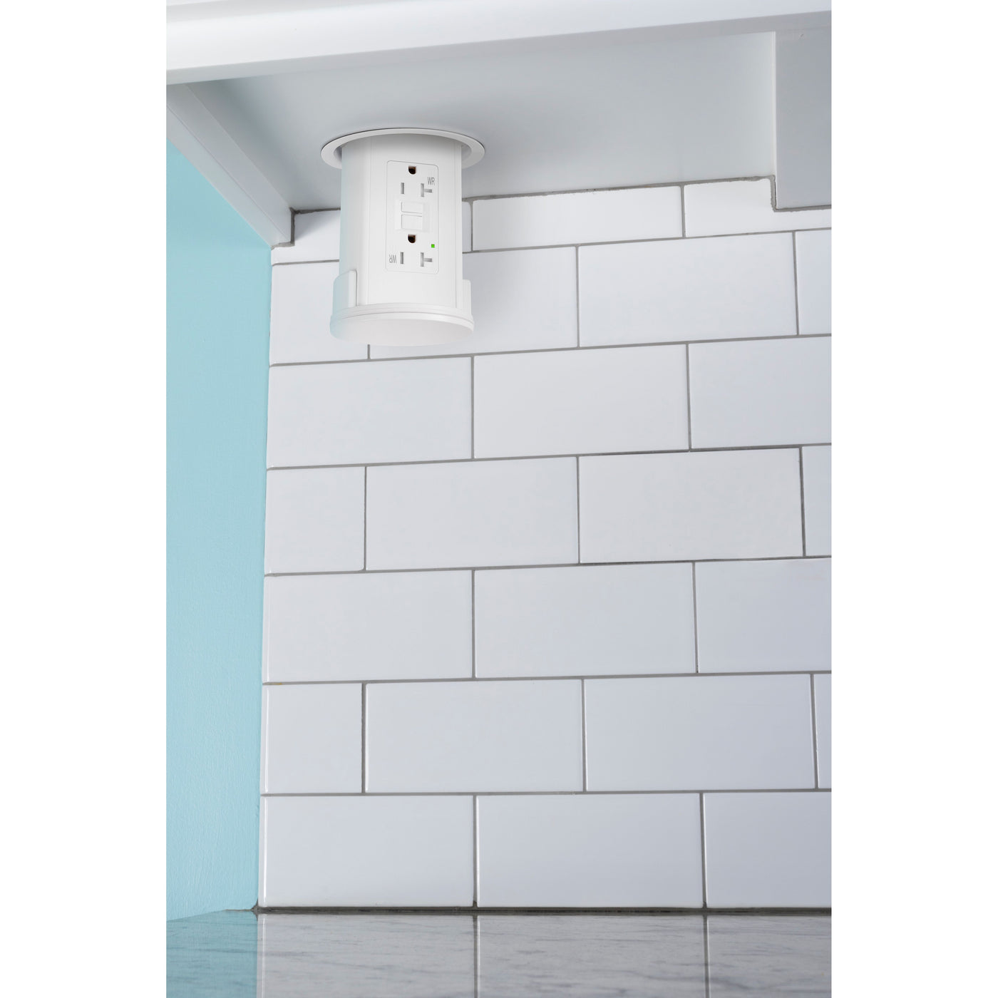 Keep your backsplash outlet free with the Lew Electric UCPDR20GD-AWT-WT, it is an under cabinet pop down power outlet that hides in your kitchen cabinet. When closed, the top is a round metal white color that hides under your cabinet trim, when pressed, the unit pops down 5 3/8" and exposes the power outlet. The body of the unit is all white, including the outlet, giving it a modern and sleek look. When you are done, press the top till it latches shut and is back hidden under your cabinet, there are no buttons to push to retract the unit. The outlet features a 20 Amp GFCI rating, and two tamper resistant (TR) plugs.