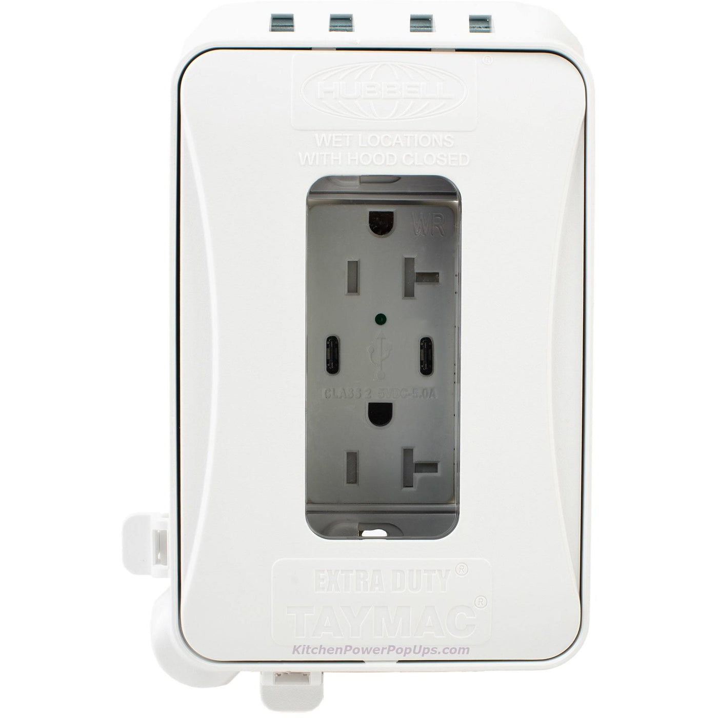 The included white outlet is a perfect match for the white colored box, the outlet is 20 Amp rated with Tamper Resistant (TR) plugs. There are 2 USB-C ports that offer 5 Amps of shared charging. The ports are intelligent charging ports and will sense the device being plugged in, they will then safely send the maximum amount of power the unit can handle. The outlet meets NEC code installed in the box because it has the required weather resistant (WR) listing. Also included is the gasket and mounting hardware for easy installation. The outlet will need to be installed on a GFCI circuit.
